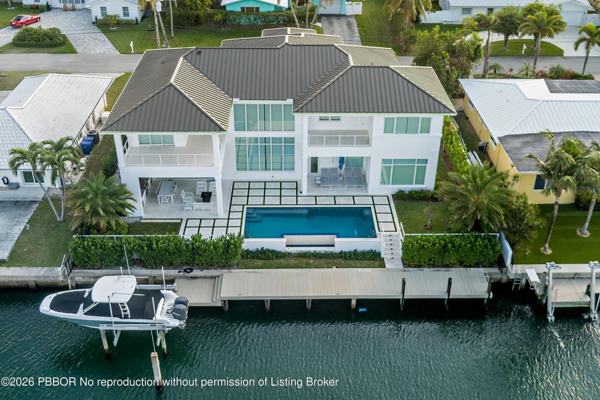 This new construction waterfront residence, completed in 2023, is set on a 100 x 110 lot with 100 feet of water frontage, a private dock, and views of both the canal and Intracoastal. The home offers 7,246 total square feet with 4 bedrooms, 4.5 bathrooms, with water views from nearly every room. A foyer leads into the main living spaces, with a study area just off the entry connecting directly to the living room. The living room features floor-to-ceiling glass, a fireplace, and expansive water v...This new construction waterfront residence, completed in 2023, is set on a 100 x 110 lot with 100 feet of water frontage, a private dock, and views of both the canal and Intracoastal. The home offers 7,246 total square feet with 4 bedrooms, 4.5 bathrooms, with water views from nearly every room. A foyer leads into the main living spaces, with a study area just off the entry connecting directly to the living room. The living room features floor-to-ceiling glass, a fireplace, and expansive water views. The kitchen connects to both the dining and living areas and is designed for everyday use and entertaining, with a large island, walk-in pantry, custom lighting, water filtration system, wine refrigerator, and a Miele built-in coffee maker. Large doors open to a covered loggia with a summer kitchen overlooking the pool and waterfront. The first-floor guest suite includes a walk-in closet, direct access to a private guest loggia, and a spacious bathroom with dual sinks and a separate soaking tub. Upstairs, the primary suite faces the water and features dual walk-in closets, a private covered balcony, wet bar, and a bathroom with dual vanities and a separate soaking tub. Two additional guest suites, each with private balconies and en suite baths, complete the upper level, including one with water views. A loft area and upstairs laundry add additional functionality. Outdoor living is centered around the heated infinity-edge pool, open patio, covered loggias, summer kitchen, and a powder room with sauna, all positioned along the water. The private dock includes water, electric, and a 14,000 pound boat lift. Additional features include full impact glass and doors, fully built-out closets throughout, main-level laundry, a three-car garage configuration, and additional driveway parking.
